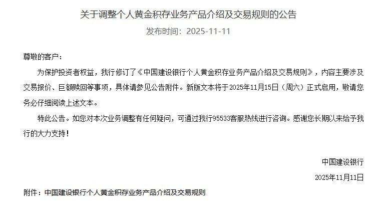 11月11日点搭网配资,建设银行官网发布关于调整个人黄金积存业务产品介绍及交易规则的公告。为保护投资者权益,该行修订了《中国建设银行个人黄金积存业务产品介绍及交易规则》,内容主要涉及交易报价、巨额赎回等事项,新版文本将于2025年11月15日(周六)正式启用。