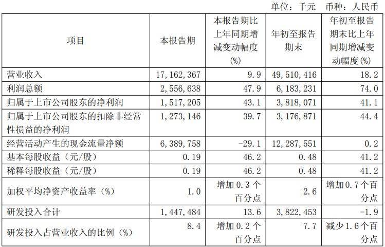 根据未经审核财务数据,中芯国际前三个季度营业收入为人民币495.1亿元,较去年同期增长18.2%;净利润为38.1亿元,同比增长41.1%。业绩增长主要得益于晶圆销量同比增加及产品组合变动。毛利率为23.2%,较去年同期增长5.6个百分点。